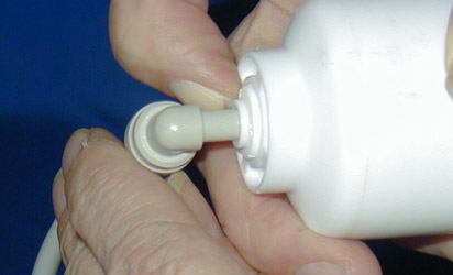 6. Now, pick up the storage tank. If it is empty, very light, close the faucet and let the tank refill. If it still has water in it &mdash and this is usually the case &mdash attach a bicycle pump to the air valve on the tank. (It's on top of some tanks, on the bottom of others, and sometimes on the side.. You'll have look for it. It looks like an stem where you add air to your automobile's tires.) With the faucet still open, pump air into the tank. Water will start to leave the tank through the open ledge faucet. Continue to pump air into the tank slowly and steadily until all water is out of it. It will return to a fast drip. Try to leave about 7 pounds of pressure in the empty tank. If you don't have a low-pressure gauge, guess. The exact amount isn't that critical. Don't over-air the tank, however, because you won't be gaining more pressure; you'll just be leaving less room in the tank for water.